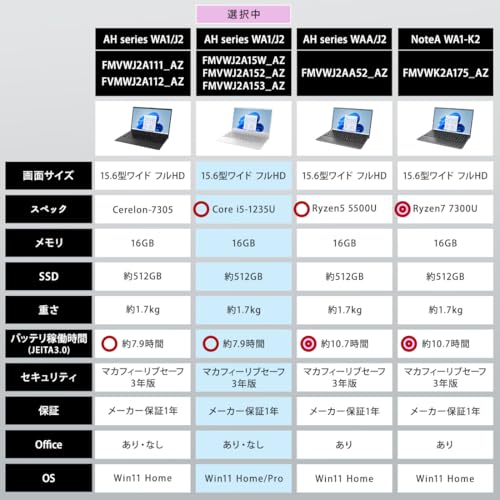 大手国内ブランドで安心感のある機種。16インチWUXGAで、一般的な15.6インチフルHDよりも大きくて情報量の多い画面が魅力です。さらにバッテリーが着脱式で、劣化して容量が少なくなっても(交換用バッテリーを入手できるあいだは)自分で交換できます。SSDの容量が256GBと少なめ。