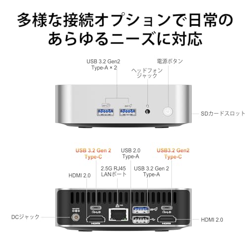 Intel N150搭載のミニPC。N150搭載機としてはややお高めですが、2万円前後の機種よりメモリーとSSDの容量が大きく、Type-Cに対応している点がポイント。さらに高速なDDR5メモリーが使われています。N150をガッツリ使うなら、やはりこのくらいのスペックは必要です。